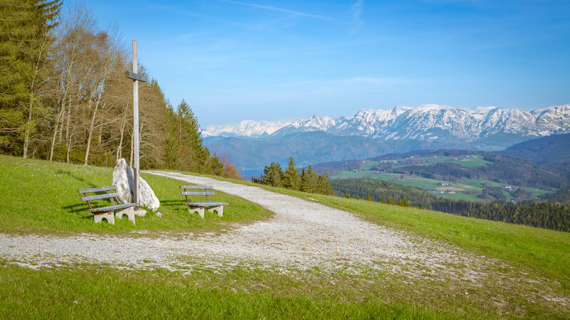 Sonnenuntergang genießen auf der 32m hohen Plattform des Attergauer Aussichtsturms am Lichtenberg. Von dort, in über 900m Seehöhe, blicken wir dabei auf das Höllengebirge und auch der Attersee ist noch ein wenig zu erkennen.